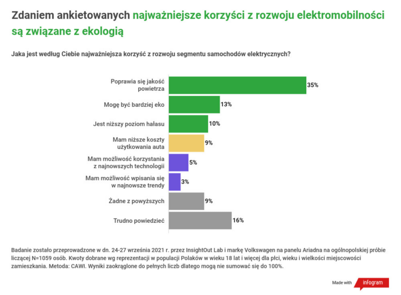 - 35% badanych uważa, że główna korzyść z rozwoju elektromobilności to poprawa jakości powietrza